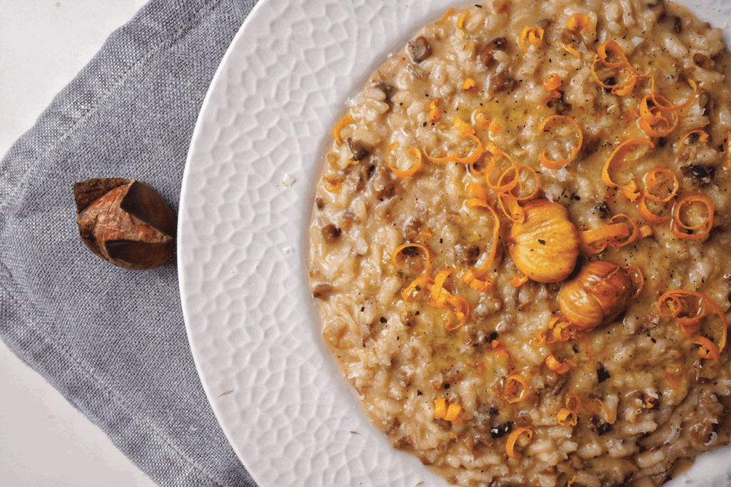 2. Turn up the heat and start adding the hot stock, little by little, stirring continuously and letting each addition be absorbed before adding more. After about 15 minutes add the chestnuts and brandy, then continue adding the stock and cooking for 5 minutes. When cooked the rice should still have a bite but no crunch.