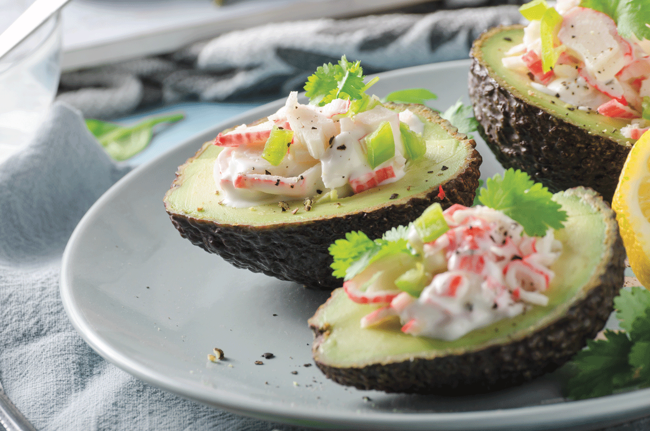 To start with we’re combining the most delicious, healthy ingredients of avocado and crab meat. If you want to make it in advance for a lovely evening dinner in the garden, just remember to drizzle the avocado flesh with a little lemon juice to prevent discolouring.