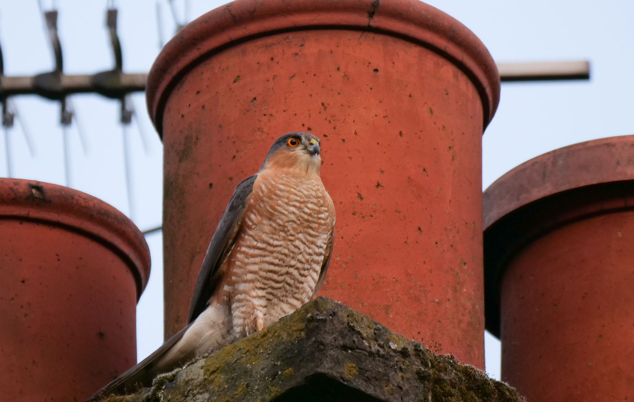If the ‘Sparrowhawk’ hovers then it is not one. Around here that would most likely be the similar sized but pointed-winged Kestrel, or the altogether larger and chunkier Common Buzzard. Up close the male Sparrowhawk is stunning with slate blue upper plumage, and orange around the face and on the gently dark-barred breast.