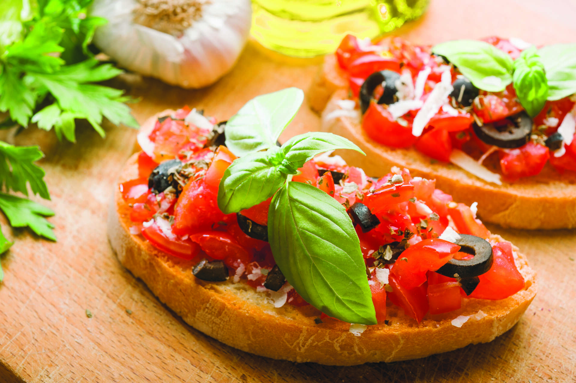 Bruschetta with plum tomatoes, olives and goat’s curd
