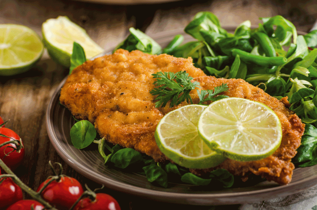 5. To serve, place hot schnitzel on plates and top with salad. Enjoy!