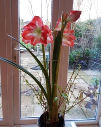 They need 6-8 weeks to grow, so I plant them in early November in good quality compost, leaving half the bulb above the top of the compost. Then keep them well watered but not waterlogged in a warm sunny spot and wait for the magic to begin! Because they can produce 3 – 4 tunnel shaped florets of 20 – 25cm wide at the mouth, they tend to be top heavy, so I create support for them by pushing 1m long willow and dog wood cuttings into the pot around the bulb and then tie them together, so the flowers appear above them, as you can see below.
