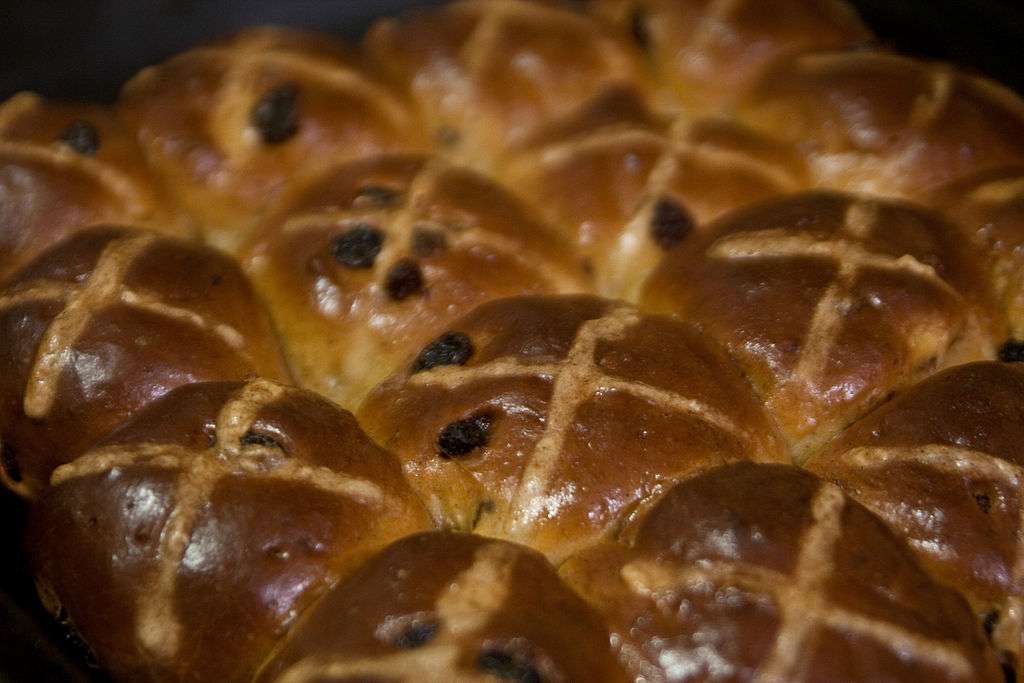 Heat oven to 220C/200C fan/gas 7. Mix the flour with about 5 tbsp water to make the paste for the cross – add the water 1 tbsp at a time, so you add just enough for a thick paste. Spoon into a piping bag with a small nozzle. Pipe a line along each row of buns, then repeat in the other direction to create crosses (see Tip below). Bake for 20 mins on the middle shelf of the oven, until golden brown.