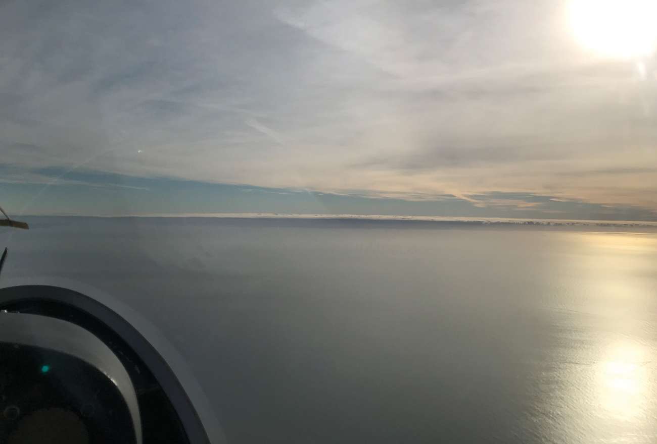 Flying over the English Channel. If you look closely you can just see an Offshore Wind Farm to the right of the cockpit