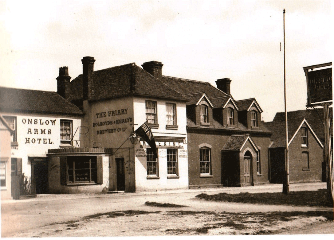 The proprietor of the inn decided that it should share in some of this glory, as the Onslow family had lived at Knowle for many years, before moving to Clandon, and several members of the family were buried in the parish church. The inn’s name was therefore changed to ‘The Onslow Arms’. It was the village’s principal inn. In the mews behind, it had accommodation for guests’ horses – and, later,