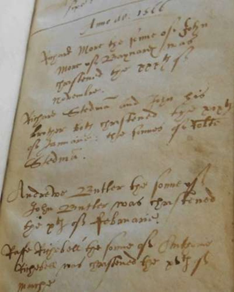 page of the Parish Register of Christenings in 1566. They are thought to have originally been French glass workers. They were not a large and spreading family, but they had a steady line of healthy male children who were happy to remain in Cranleigh. They served the village as tailors, based in what is now Lemongrass restaurant, but died out in the 19th century, and were followed there by Chart’s the outfitters.