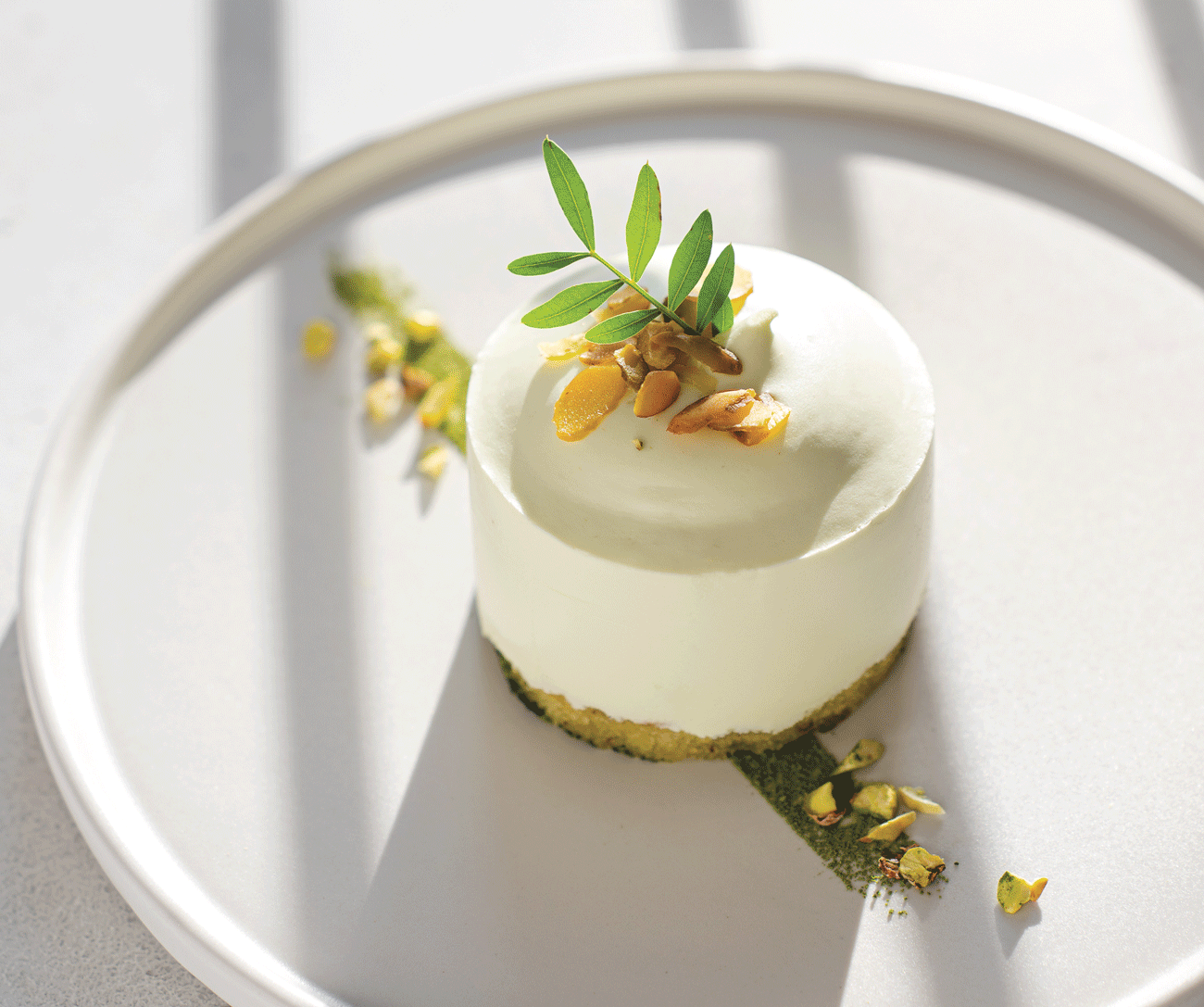 6. Beat the egg whites until firm, add tablespoon of caster sugar and whisk until stiff. Add a small quantity of the whites to the pistachio paste to soften it, then fold in the rest of the egg whites and pour into the soufflé dishes or ramekins.