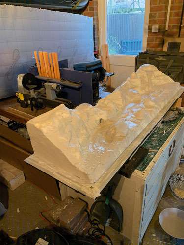 Once everything arrived my first step was to cut and router a wooden base, along with 3D printed lettering on the front. Next I cut and layered up the basic levels of landscape using Celotex foam, this is usually used as insulation but is known for being an ideal material for carving on a larger scale. When cutting foam like this, it’s necessary to picture all of the shapes and forms of the landscape that remain hidden within. From above this method bears some similarity to the contour lines on a map. After bonding the layers together with expanding soft foam I carefully began carving the landscape and valley using a large array of knives. I formed the mountains and rivers with a series of techniques that allow foam to take the illusion of natural erosion, varying through the earth and rocks. Using a combination of glue, filler and plaster I made a mixture that could be applied along with a scrim, to the majority of the model, giving it rigidity and once sculpted into shape, some added form and dimensionality.