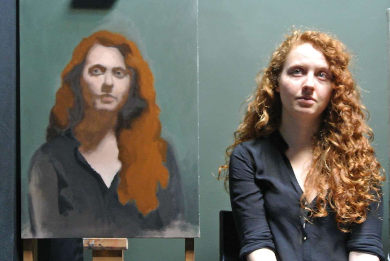 A painting in progress, head and hair casting shadow on neck and shoulders