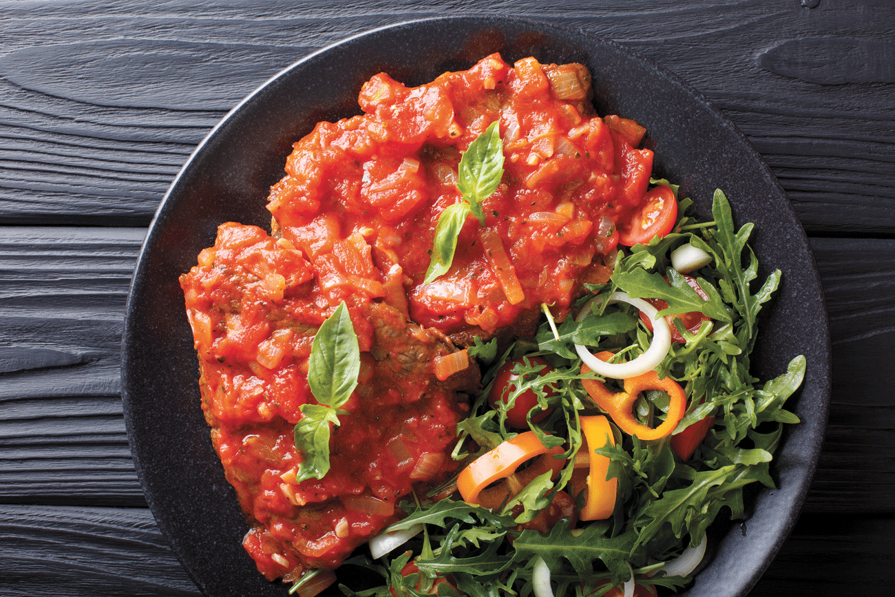 3.   When the sauce has reduced, flavour it with oregano, salt and pepper. Remove the garlic. Dip the slices of meat in the sauce (if they are too big, you can cut them in half) and let them cook for 2 minutes per side. Garnish with a few basil leaves, if you wish and serve your steak pizzaiola immediately.