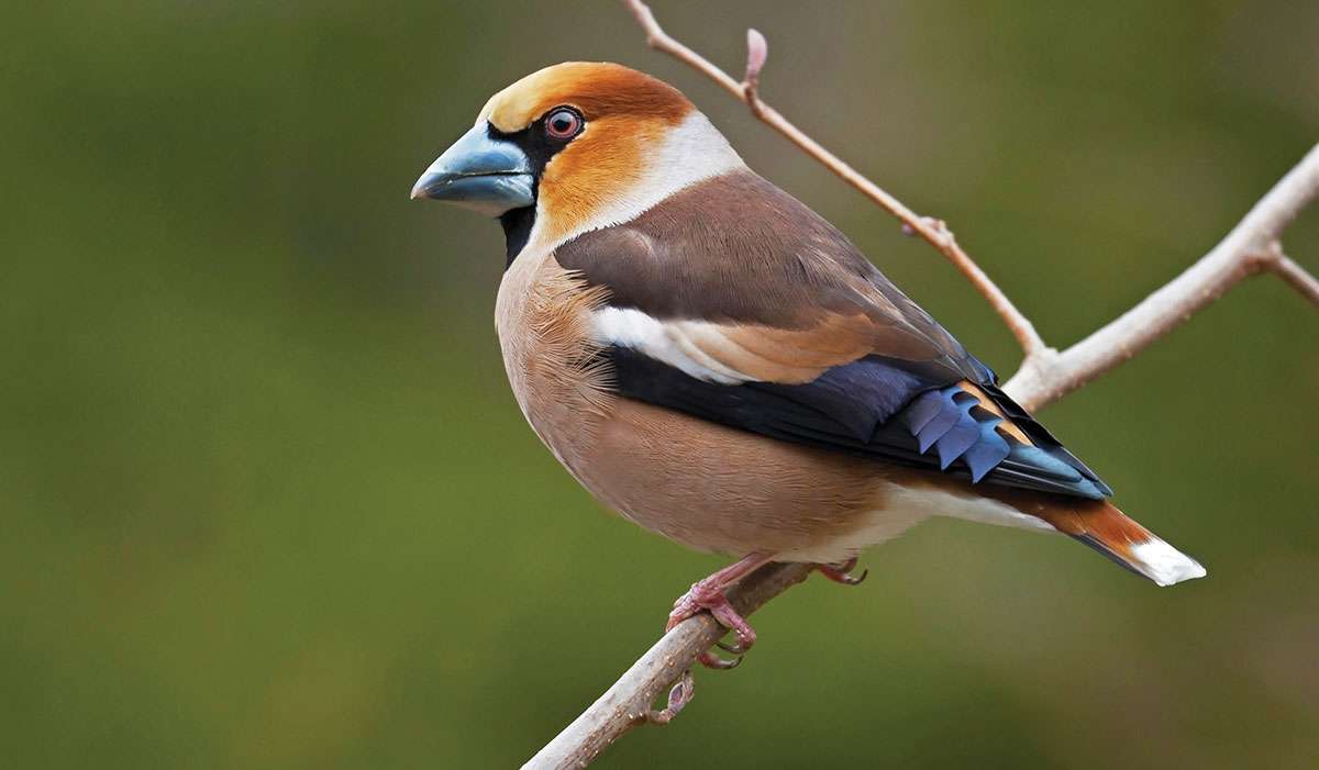 The orangey-brown Hawfinch is a comical looking bird and quite unlike any other we see in England. Its facial expression reminds me of a sad clown and its grey neck band looks a bit like a scarf wrapped above the brown coat of its back. It has broad white wing bars and a large white band across the tip of its stumpy tail. In summer it has a glossy blue edge to its inner wings.
