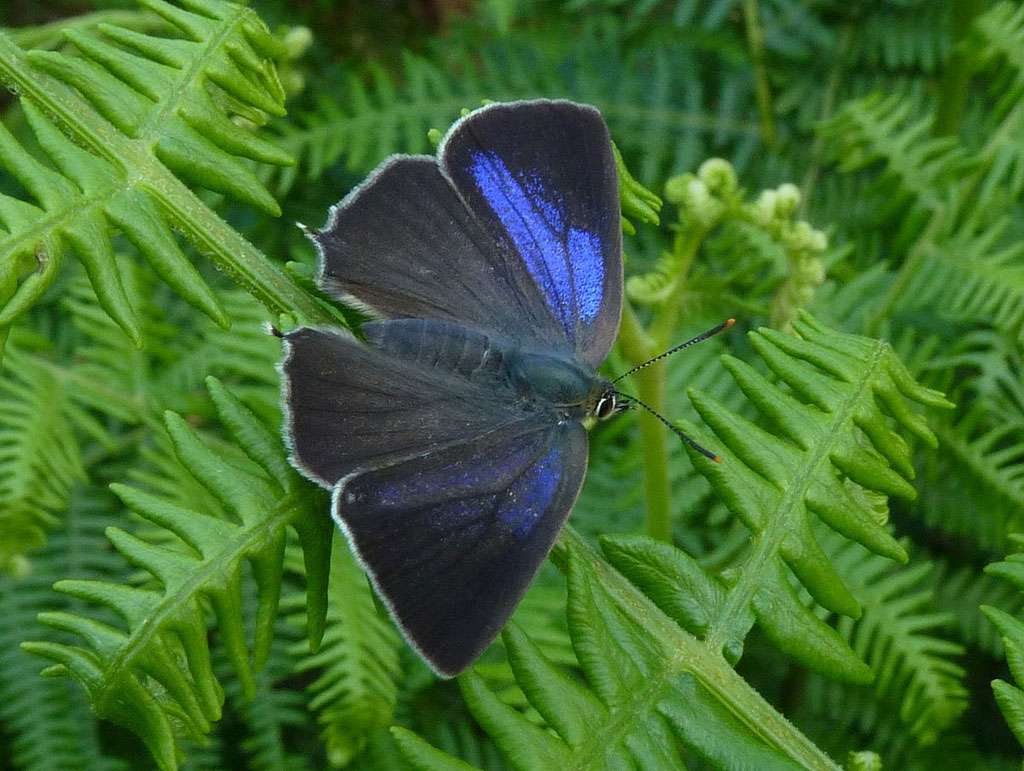 It is up in the oaks, though, where the action has really been happening this summer. I’ve recorded unprecedented numbers of small Purple Hairstreak flitting among the tree tops. In the early evenings the show begins as they court in a spinning frenzy, their undersides flashing silver as they dance.