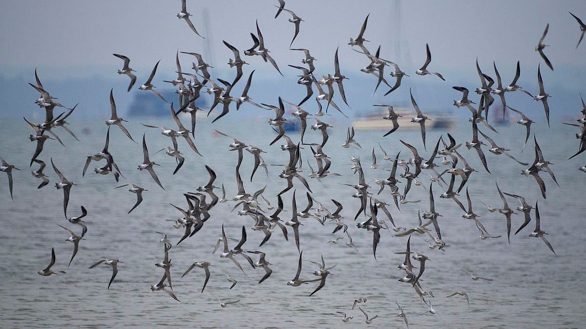 Bar-Tailed Godwit flock in flight © Ian Kirk, Broadstone, Dorset UK
