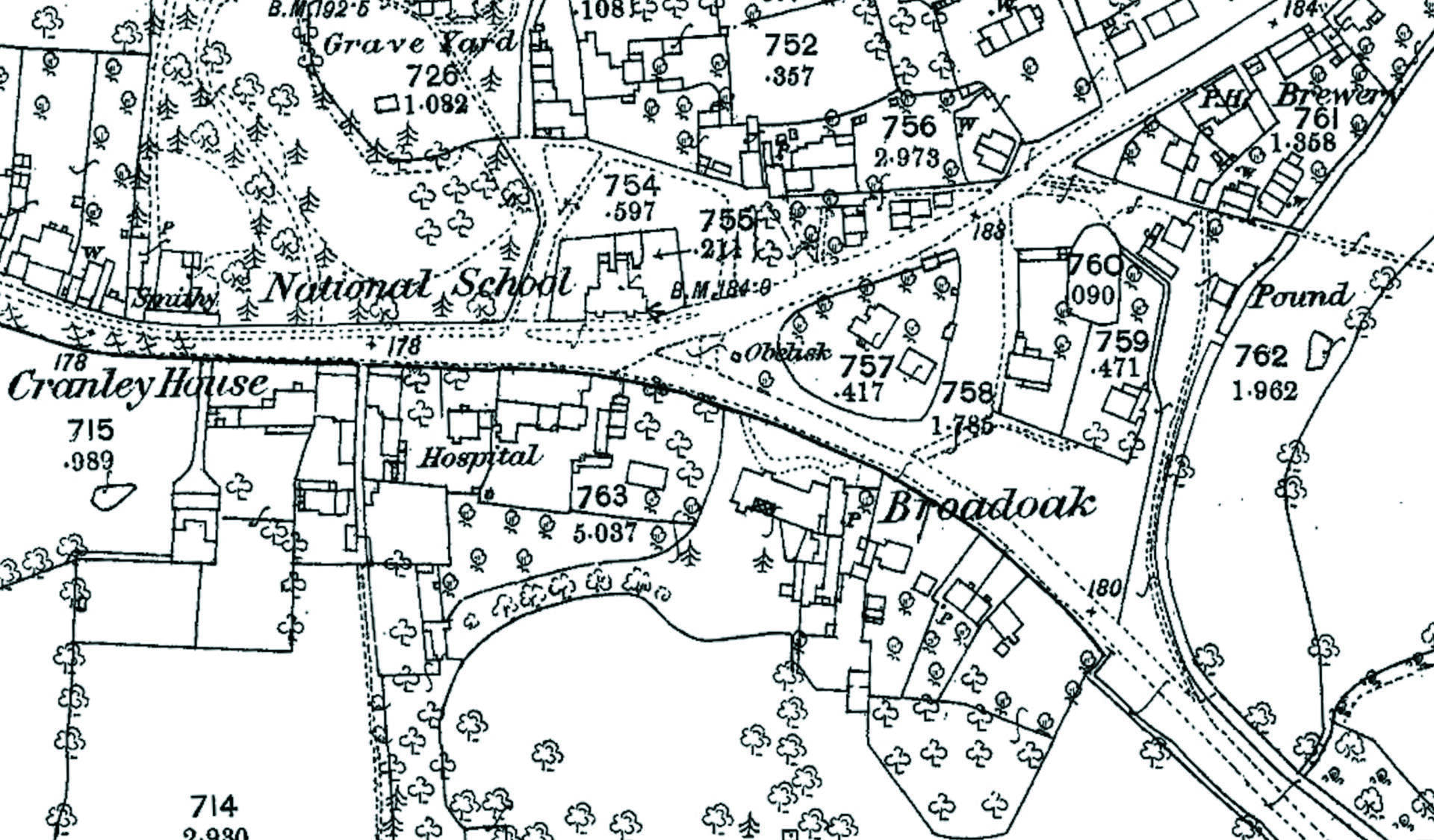 In the 1870 edition of The Imperial Gazetteer of England & Wales, Cranley is referred to as a village, a parish, and a sub-district in Hambledon district in Surrey. Its station on the Guildford and Horsham railway is noted as is its post office “under Guildford” and a fair being held on Whit-Tuesday. At the time the population was 1393, housed in 280 dwellings, quite a difference from today! The following map shows the Hospital, opposite the National School, within the eastern part of Cranley in 1870.