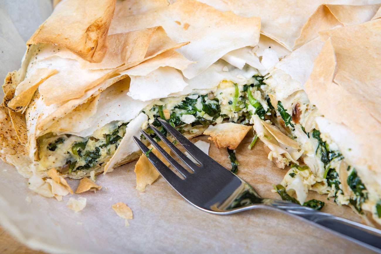 - Carefully unroll the filo pastry. Cover with some damp sheets of kitchen paper to stop it drying out. Take a sheet of pastry and brush liberally with some of the sun-dried tomato oil.