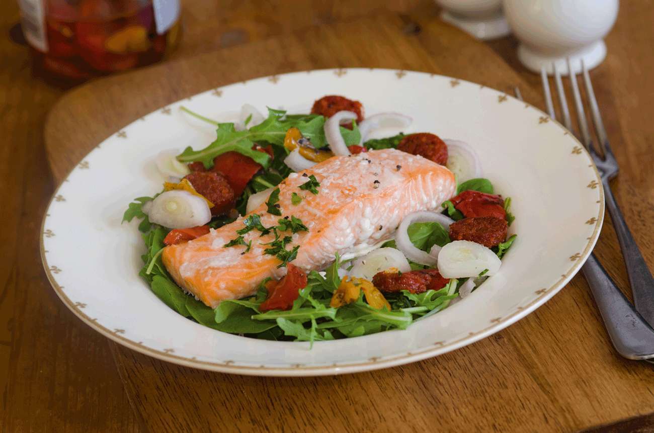 Pan-Fried Salmon and Chorizo with tomato and basil – Serves 4