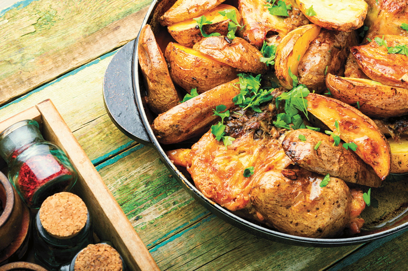 6. Place chicken legs on top of potato mixture. Add 2 tablespoon of water to the pan, then transfer to the oven and cook for about 20 minutes until the chicken it thoroughly cooked. Serve hot in the cooking pan and enjoy!