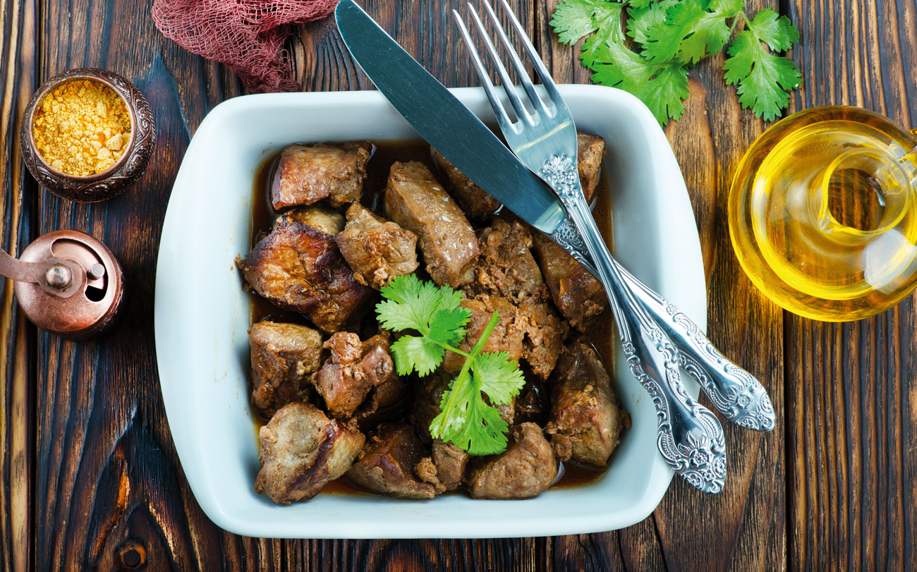 4. Wipe out the pan with kitchen paper, then add the butter. Heat until it foams, then carefully place the slices of the calf’s liver in the pan. Cook on a high heat for 2 minutes on each side.