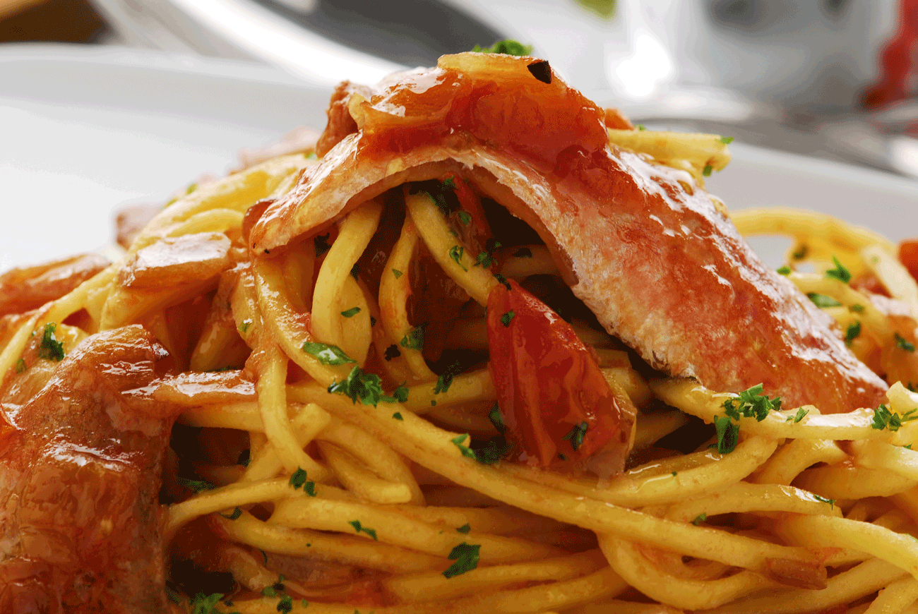 Linguine with red mullet, tomatoes, olives and homemade breadcrumbs – Serves 4