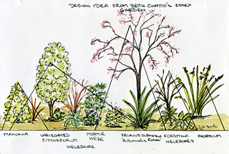 By December, the deciduous trees and shrubs have shed their leaves and we can see the bare structure of the garden and start to plan what changes are needed to make the garden even better next year. There are various ideas about what the percentage of evergreens/deciduous plants should be but I usually try to use 30% evergreens, 30% coloured bark, such as cornus, salix and acers and 40% deciduous and herbaceous plants. Beth Chatto was a wonderful plants-woman, garden designer and author and she developed the concept of creating flower beds which mirrored the shape of a town scene, with the plants representing tall church spires, town halls, office blocks, etc., as I have shown in the drawing opposite.