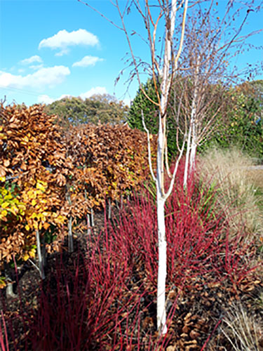 As there are fewer jobs to do at this time it gives us the chance to look at the colours that can be found around us. This picture shows the wonderful combination of white stemmed Betula jacquemontii ‘Silver Shadow’, under planted with the glorious, bright red stemmed Cornus alba Sibirica, in a garden that I passed in Cranleigh the other day. It is definitely one to replicate in any garden to bring light and colour in the winter months. Also, there are so many different tree barks, such as this lovely oak, which is covered in colourful lichen too.
