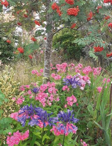 There are still some lovely combinations of plants around, such as these red Rowan berries, above a mass of pink phlox and rich blue agapanthus flowers set amongst a mass of greenery as the back drop that I saw in a front garden in Cranleigh – perfect!