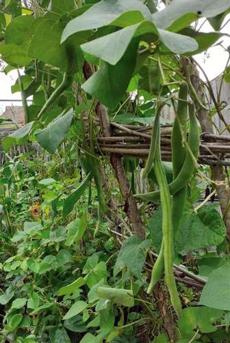 At last I can show you the very successful ‘shuttlecock’ structure for growing runner beans. As you can see the beans hang down freely on the outside, rather than getting caught up in other stems and leaves. The crop is later than usual because of the lack of sunshine but I still picked a kilo in the first haul. A friend has also used the idea and is delighted with his crop!