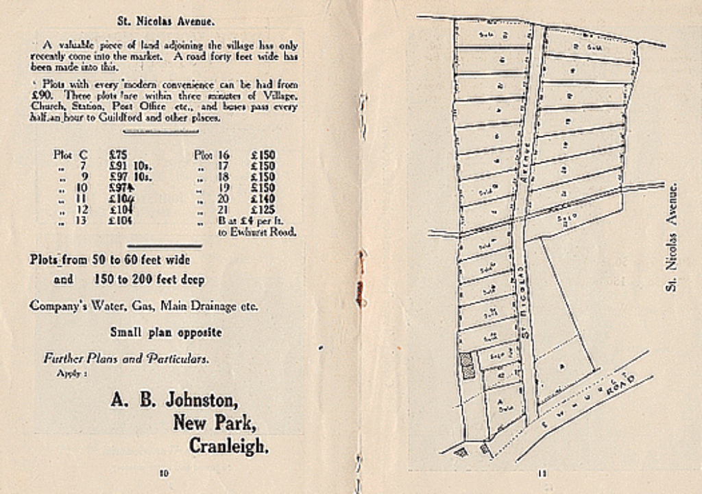 Across Ewhurst Road from St Nicolas Avenue, on the site of Brookside, was the building firm of Auchterlonie & Reeves, well placed for building at least some of the houses here. The quality house called Concord, on the left next to the cemetery footpath, was put up by one of the directors of the firm, James Reeves, as his own home.