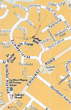 Go along the road to St Nicolas Close on the right. St Nicolas Avenue used to end at this point, with a farm gate and farm meadows beyond it, until the Glebelands estate was built in the 1950s, when the roads were linked up.