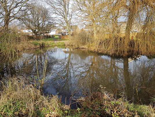 Summerlands was planned with plenty of open spaces and woodland. Several of its road names have historical sources. Cross the road and go left about 100 yards, beyond Kiln Copse, to a marked footpath on the right leading to the conservation pond, originally Capt. Butt’s trout pool. Go right to the information board, checking whether there are currently any resident moorhens. After circling the pond, follow the path to the big open space and make for the entrance to the copse – another great asset for the estate.