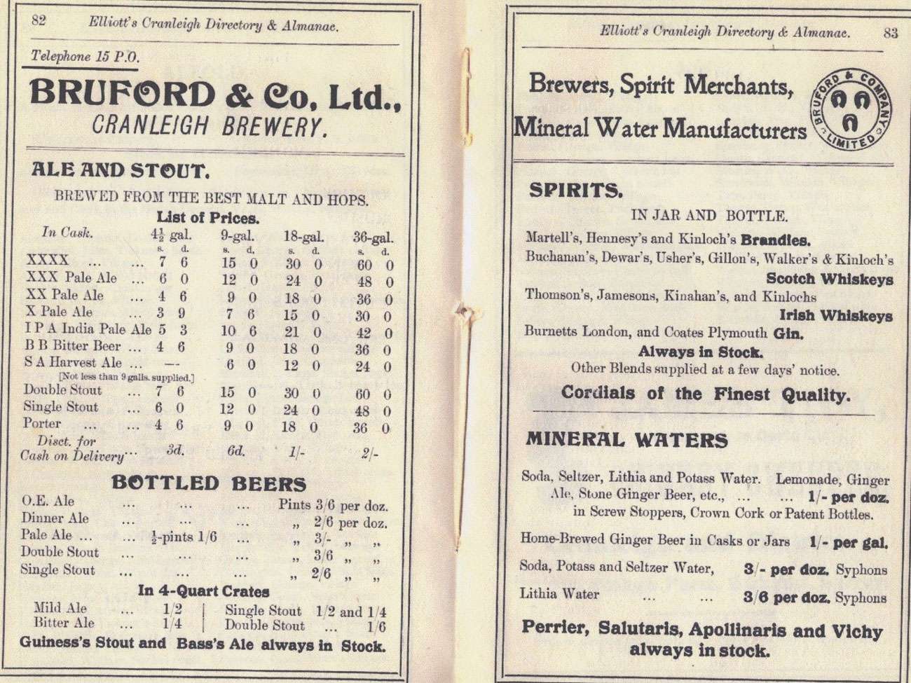 It is amazing that such a large and substantial building as Bruford’s Steam Brewery could have vanished without trace and been forgotten. For thirty to forty years it stood in a prominent position right on the High Street (known as ‘The Street’ then), between Broadoak, house of the village doctor, and the Three Horseshoes. It was in full operation by 1881, giving employment to many Cranleigh men who worked as clerks, draymen, coopers, bottlers, cellarmen and mineral water makers. Presumably, too, it would have given its distinctive smell to this end of Cranleigh.