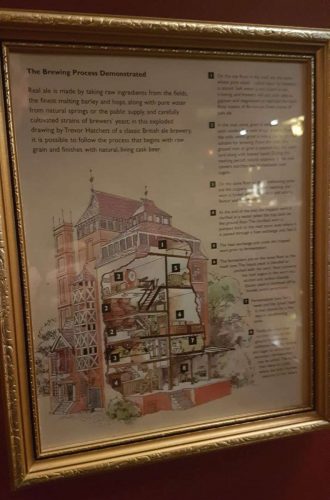 Bruford’s Steam Brewery owned the next-door pub, the Three Horseshoes, and also the White Hart in Ewhurst Road. The brewery’s trademark was three horseshoes, as seen on their stone bottle. Inside the pub is a useful chart of the beer-making process that would have taken place in the brewery.