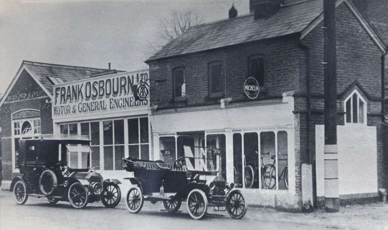 Soon after 1910, the brewery was taken over by a larger one which began reducing its operations in Cranleigh. By 1913 it was partly dismantled, and Frank Osbourn had moved his car saleroom/garage to the front of the site. Osbourn started his business in 1910, with a small garage in Ewhurst Road (where the Chinese restaurant, Forbidden City, now is), but the growing popularity of motor cars meant that his business expanded rapidly. It seems, by comparing the old pictures of Bruford’s and Osbourn’s, that the brewery buildings fronting the Street were adapted for the car saleroom.