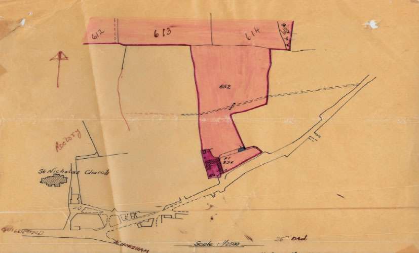 Sketch map of 1913. Pink is the land of Parsonage Farm which was being sold; deeper pink denotes the farm buildings and yard. They are just north of Ewhurst Road. Notice the footpath going east to west which is still in constant use. It crosses St Nicolas Avenue and goes beside the cemetery.