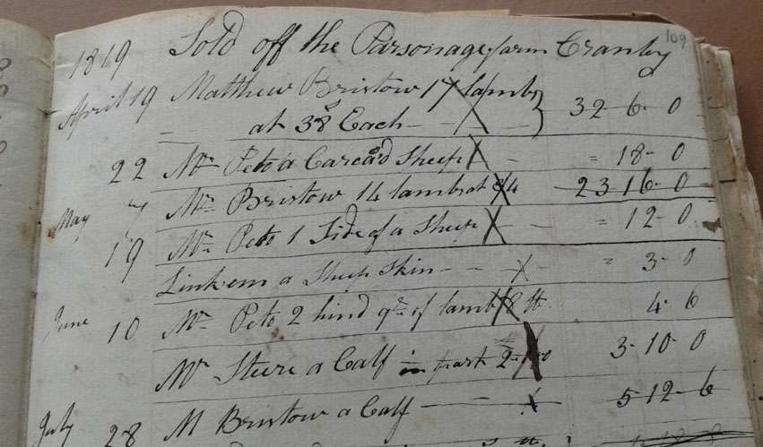 By a happy chance, we have some information about Parsonage Farm in 1819, when one James Puttock was leasing it. In his ledger book he entered the farm produce that he sold. The first two entries read: April 19 Matthew Bristow 17 lambs at 38d each = £32 6s, April 22 Mr Peto a carcased sheep = 18s. (Mr Peto was the master of the workhouse, and was buying in bulk for the inmates.)