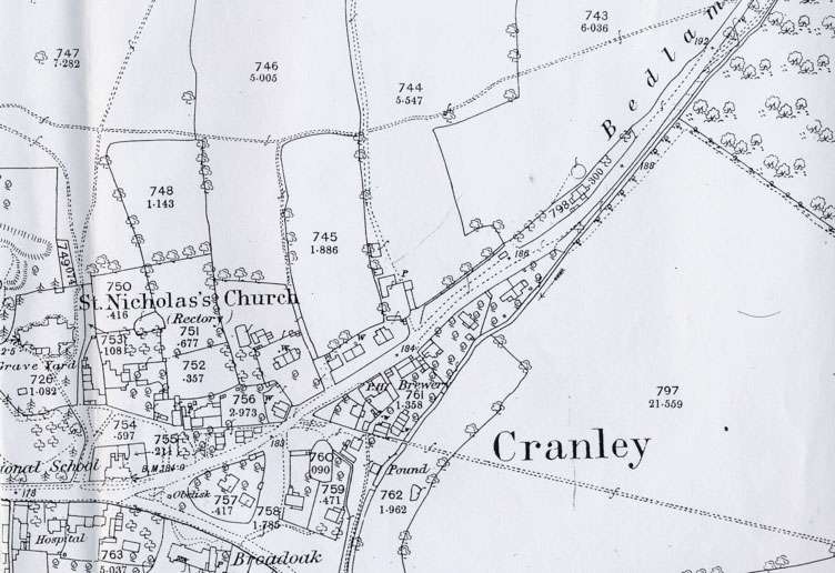 Knowing the location of the farmhouse enables us to identify it on the 1871/4 Ordnance Survey map, where it is shown but not named. It has been circled in red on the map given here. Ewhurst Road is called, rather delightfully, ‘Bedlam Lane’. The more respectable, but less evocative, modern name replaced it by 1891. It is interesting to see the Pound, shown as a little square structure, next to the brook (Cranleigh Waters) and south of the track that became Mead Road: this was a lock-up for any stray animals found wandering in the village. A brewery is marked next to the White Hart public house. This was Bruford’s Brewery that within the next few years moved to a more prominent site opposite the Obelisk.