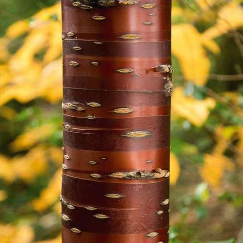 - Prunus serrula with chestnut bark – Tibetan cherry – see below
