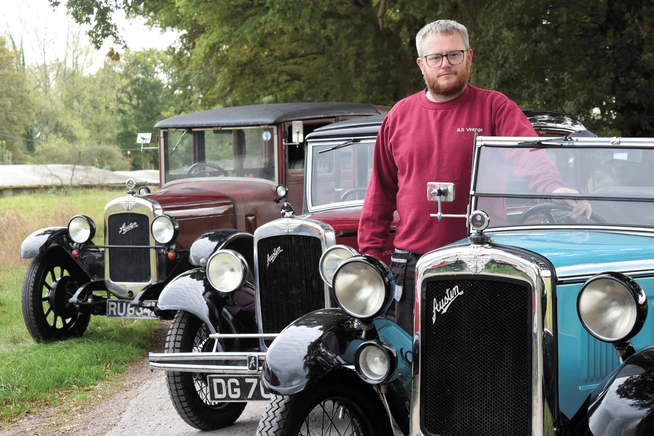 During Lockdown I took the decision to start my business, R S Vintage, which focuses on vintage and classic car sales, service and hire. Things had already started to naturally head in that direction but being home gave me more time to think about the logistics of what was needed to take the leap from a hobby to a business. It really made me realise it was now or never and after working at MES in Cranleigh for 11 years, I recently took the plunge to do it full time. It has been a steep learning curve but I wouldn’t say there’s been many major struggles. Everyone has good and bad days but fortunately I have the support of my family and friends around me when I need it, whether it be giving me a hand holding a spanner or offloading a shipping container from America. I like to keep a stock of about 10 – 15 cars at any one time and although varied they often include pre-war Austins and Morris. When I buy vehicles I purchase whatever takes my fancy – I always hope that if I like it, so will someone else! Recently the business has really started to grow and I now would benefit from larger premises to accommodate the ever-growing demand. Companies have begun to approach me for business and I’ve had various opportunities to showcase what I do through TV shows and magazine articles. This year we were approached to appear on Shed and Buried so Henry Cole and Fuzz Townshend came for a rummage round my shed. It was a really interesting day and nice to do something a little different. We actually ended up appearing in two episodes as a family which have both aired recently. It feels as though I’m finally starting to become an established business and receiving recognition.