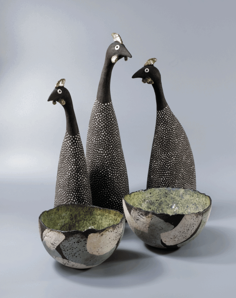 Ever since that ‘hapless’ broody hen, my love of birds has always been present in my work. We kept chickens for 20 years, getting to know their behaviour and personalities. I also enjoy making all sorts of predominantly wild or game birds, such as guinea fowl, partridges, ptarmigans, penguins, and others. Back at the beginning, Peter Simpson instilled in me the importance of surface tension and simplicity of form, key to these bird forms, which are somewhat anthropomorphic in personality. I aim to capture their ‘essence’, behaviour and movements, preferring not to be too literal, happy to stray from overly realistic interpretation. I use a mix of pinching, piecing and slabbing as hand building methods, working in a variety of clay bodies. Surface texture is important to me and coloured slips and oxides are used to enhance this, as well as glazes. All work is fired twice, the second (glaze) firing reaching either 1100º or 1245º in my electric kiln – not the same one I started with – I invested in a new kiln in 2017!