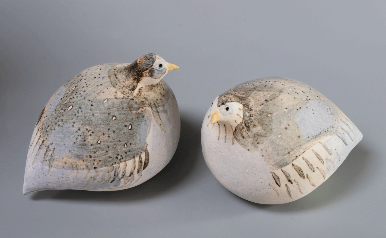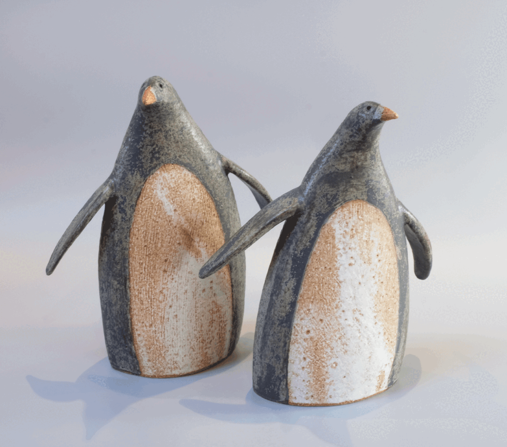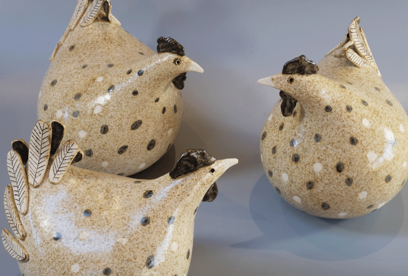 Ever since that ‘hapless’ broody hen, my love of birds has always been present in my work. We kept chickens for 20 years, getting to know their behaviour and personalities. I also enjoy making all sorts of predominantly wild or game birds, such as guinea fowl, partridges, ptarmigans, penguins, and others. Back at the beginning, Peter Simpson instilled in me the importance of surface tension and simplicity of form, key to these bird forms, which are somewhat anthropomorphic in personality. I aim to capture their ‘essence’, behaviour and movements, preferring not to be too literal, happy to stray from overly realistic interpretation. I use a mix of pinching, piecing and slabbing as hand building methods, working in a variety of clay bodies. Surface texture is important to me and coloured slips and oxides are used to enhance this, as well as glazes. All work is fired twice, the second (glaze) firing reaching either 1100º or 1245º in my electric kiln – not the same one I started with – I invested in a new kiln in 2017!