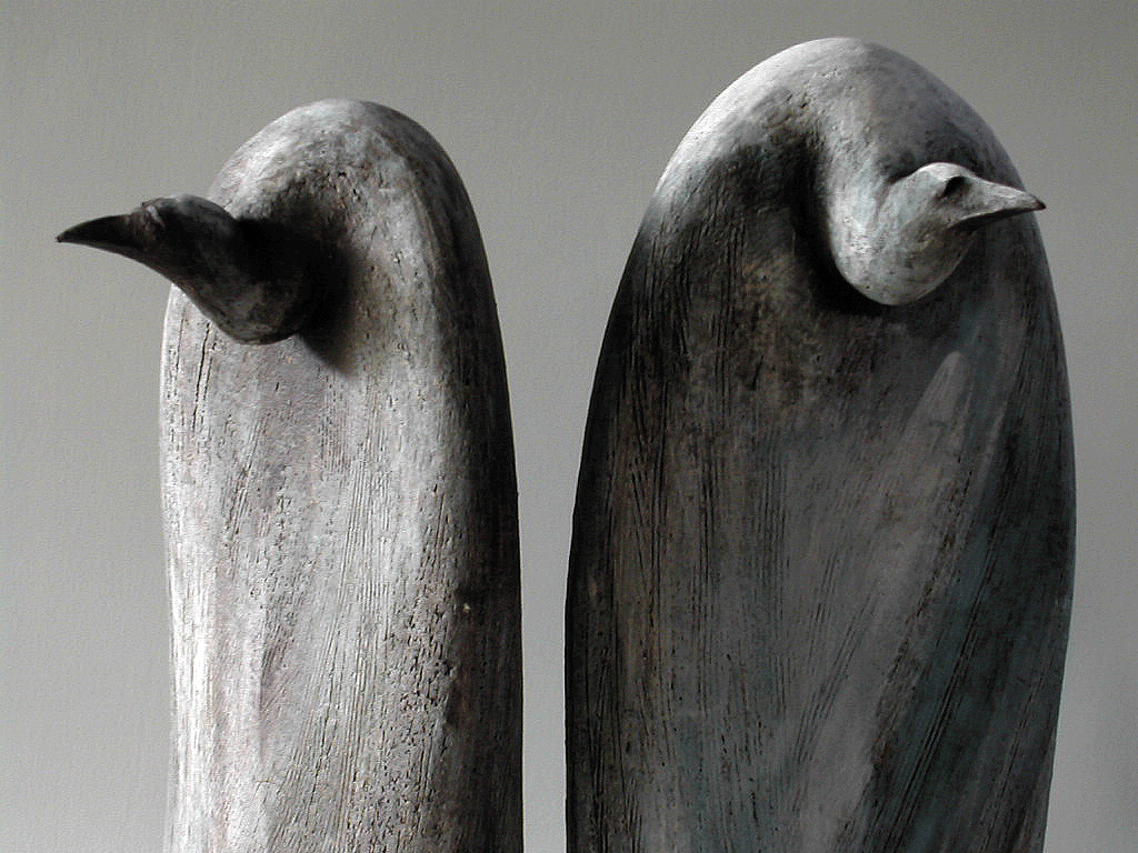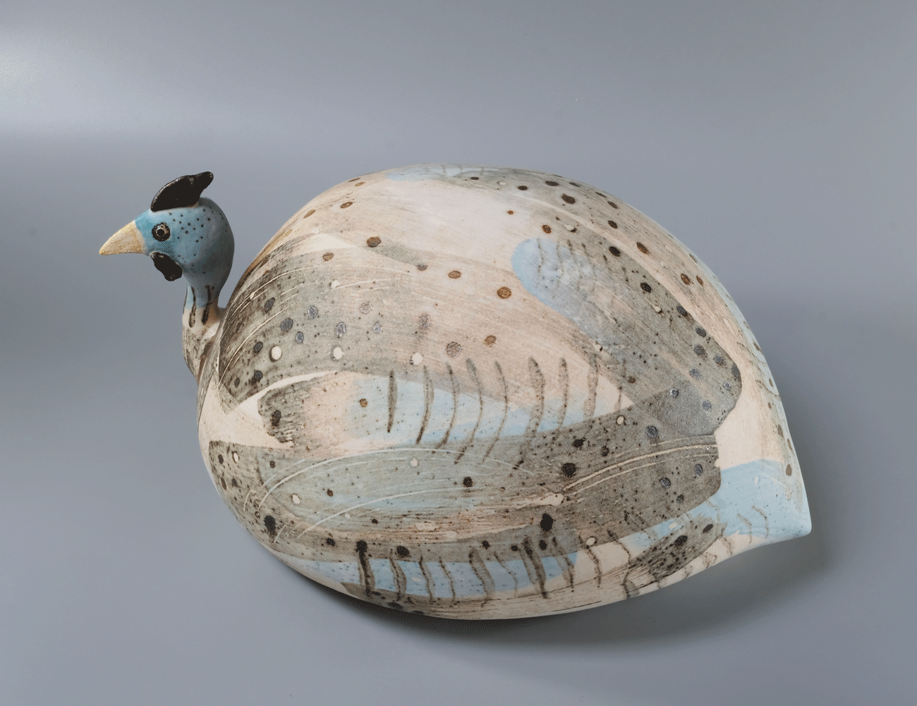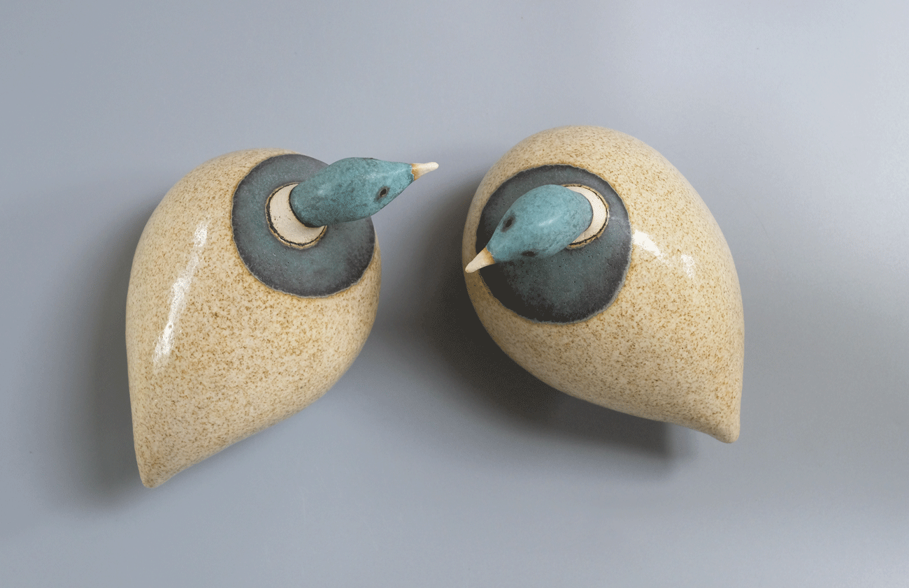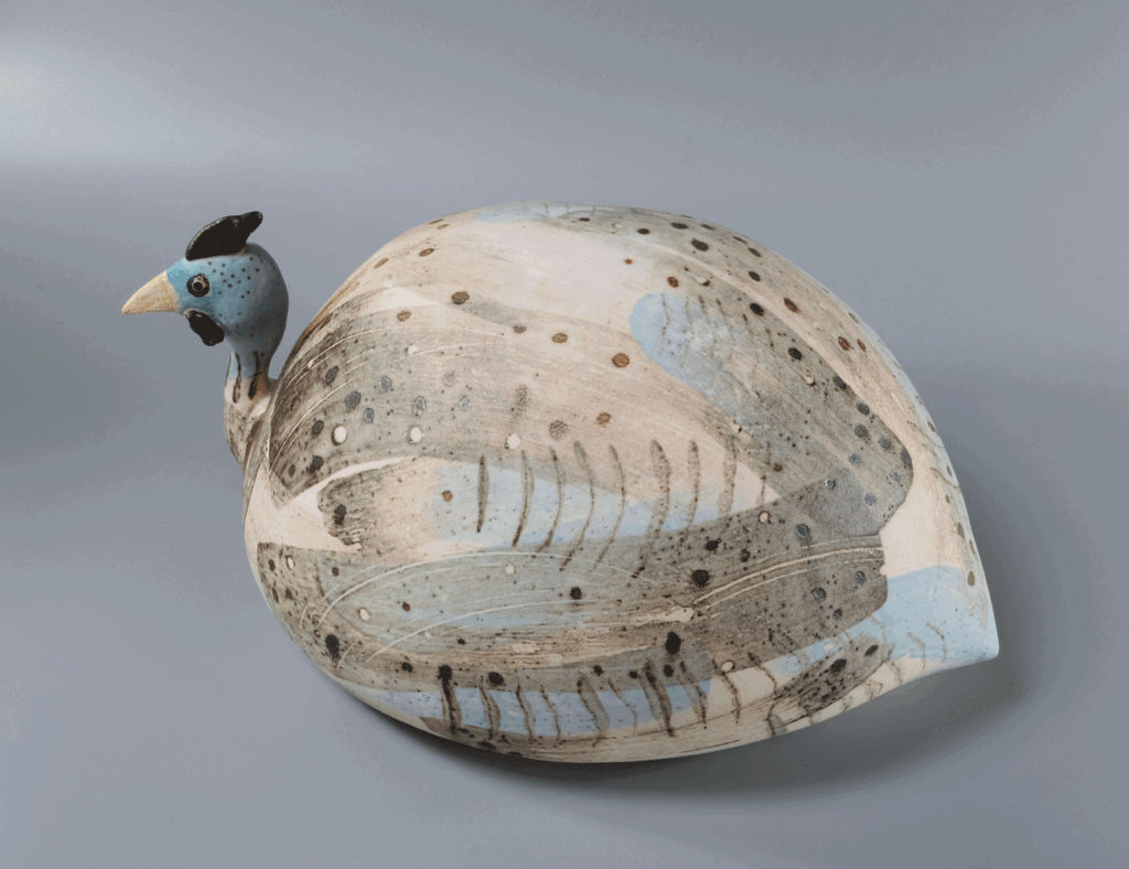 Ever since that ‘hapless’ broody hen, my love of birds has always been present in my work. We kept chickens for 20 years, getting to know their behaviour and personalities. I also enjoy making all sorts of predominantly wild or game birds, such as guinea fowl, partridges, ptarmigans, penguins, and others. Back at the beginning, Peter Simpson instilled in me the importance of surface tension and simplicity of form, key to these bird forms, which are somewhat anthropomorphic in personality. I aim to capture their ‘essence’, behaviour and movements, preferring not to be too literal, happy to stray from overly realistic interpretation. I use a mix of pinching, piecing and slabbing as hand building methods, working in a variety of clay bodies. Surface texture is important to me and coloured slips and oxides are used to enhance this, as well as glazes. All work is fired twice, the second (glaze) firing reaching either 1100º or 1245º in my electric kiln – not the same one I started with – I invested in a new kiln in 2017!