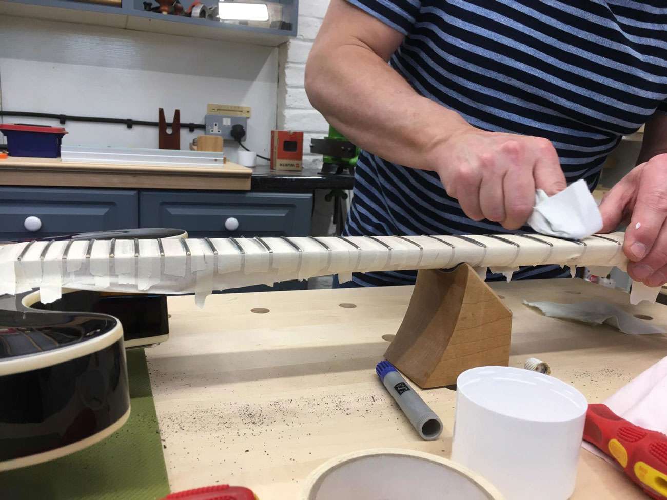 I’ve not had the pleasure of starting and finishing one yet without the interruption of work. I’d like to think I could build a high spec guitar in about 2 months if I was working 2-3 days a week. My workshop’s at home, so I could go out there for 2 hours, come out and do something else, like cut the grass and then return to work for another few hours.
