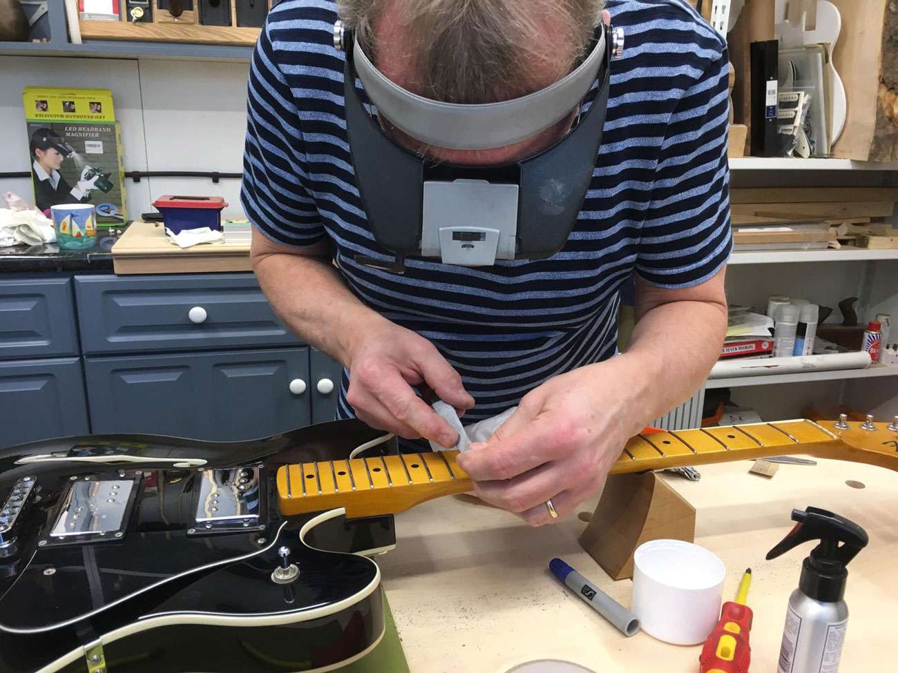 So far I’ve worked on two other people’s guitars, repairing,re-crowning and setting them up. Another one I sorted for my son Tom, who works in many situations. He was playing it at a big conference and another guitarist who plays regularly at big events commented “That’s a nice guitar.” Tom said “Yeah my dad’s done some work on it, do you want to have a go?” He did just that and thought it was amazing and borrowed it for the whole conference, so Tom had to use another one!