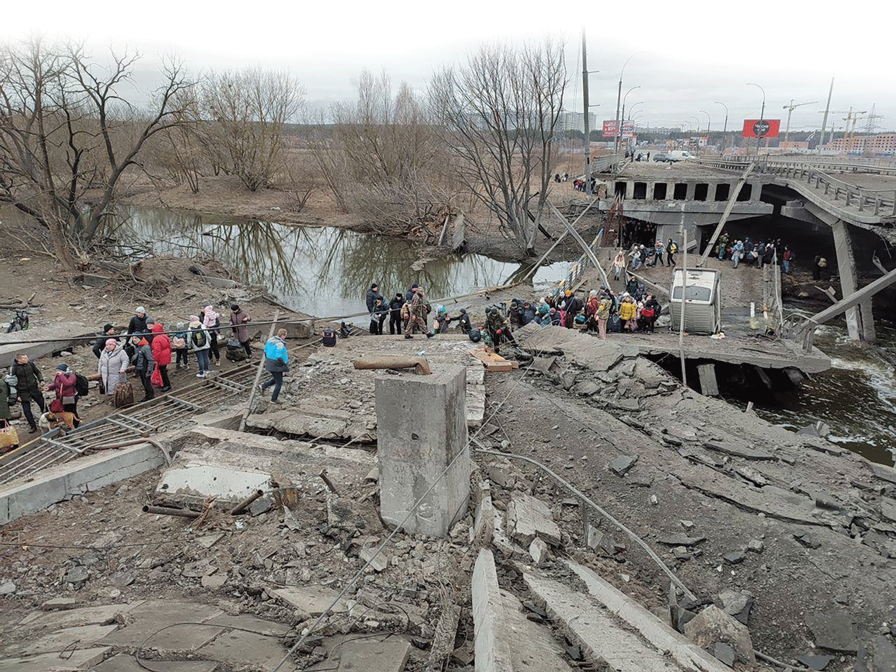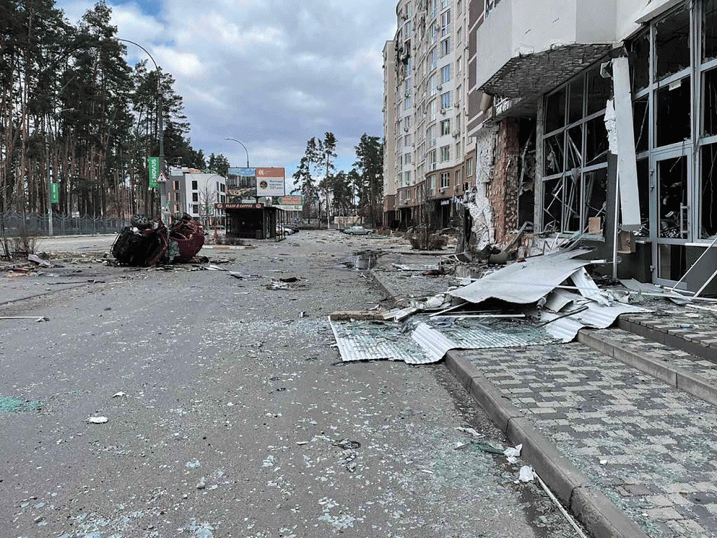 There were 6 of us in our car – ourselves, our 3 children and our nephew. His parents couldn’t leave at once so we took him as well. It was a full car in every sense. I come from a large family of 11 children, I’m the oldest. I phoned my brothers and warned them to get their families ready too. I think we had a convoy of maybe 5 cars with family and friends. It was winter time and obviously very cold. We didn’t travel far because we were caught in a traffic jam about 3km from our house and we waited and waited and waited and waited. I started to change my mind and suggested we return home. I was worried we’d run out of petrol. Subsequently I regretted that decision but that’s what we did. We turned around and went home. We unpacked many things from our car with loads of space and roof box that we’d stuffed full. We waited until about 3pm and then military jets started flying right over our heads. It got worse and worse. They were bombing though not near our place, just outside Irpin and another town nearby. There is a strategic airport in Hostomel, about 6 miles away. Then lots of Russian helicopters followed.
