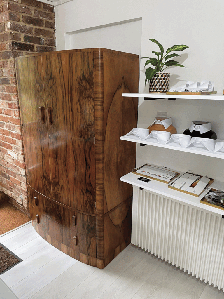 The restored 1930s Art Deco wardrobes displaying thoughtfully made garment covers and bespoke hangers to keep clients finished garments at their best