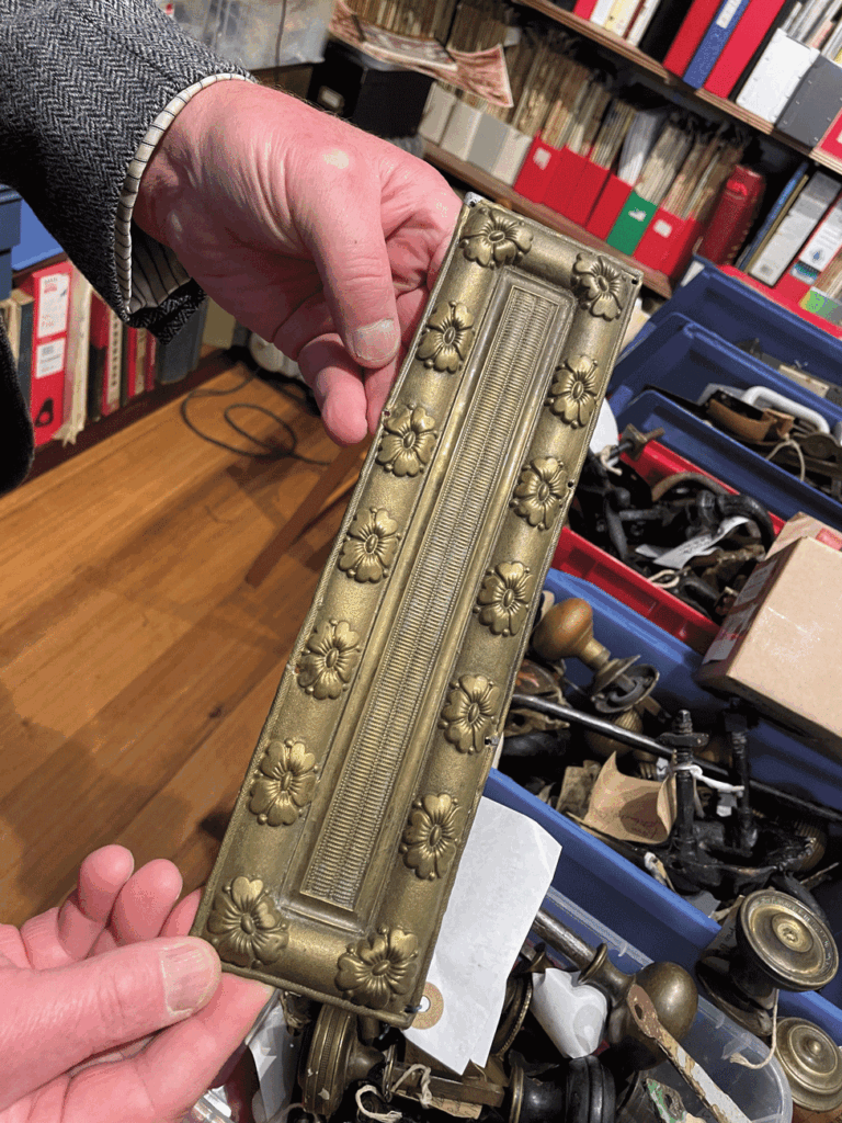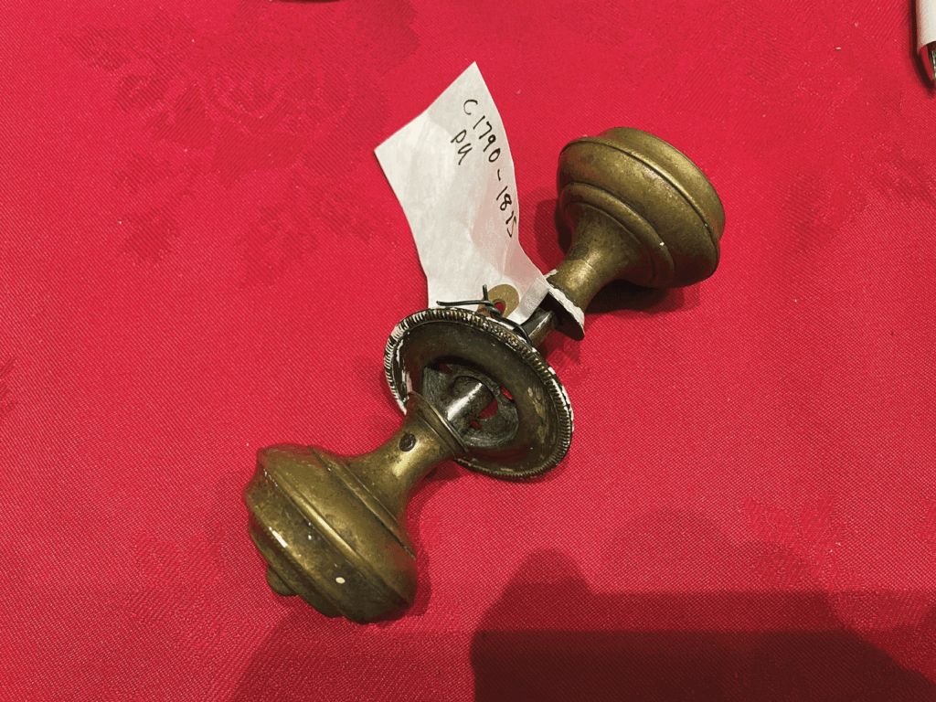 Having recently purchased a fine Grade II listed 1790s terraced house in St. Jame’s Square, Bath, Drew recently contacted me to enquire whether ‘The Brooking’ museum’s ironmongery collection contained examples of 1790s door furniture. Fortunately we hold some important examples, ranging from humble to grander varieties. Drew, on learning this, arranged to visit The Charles Brooking Teaching Gallery here at Cranleigh with a film crew, whereby they would film us talking and inspecting period door and window fittings, along with the displays in the gallery. Having photographed the appropriate door handles and locks of the types used both in the ‘polite’ and secondary areas of Drew’s house in the 1790s, he is hoping to track down similar examples. I explained firmly that nothing was for sale and that the entire collection, including the part I am maintaining at Cranleigh, now belongs to ’The Brooking’ museum charity.