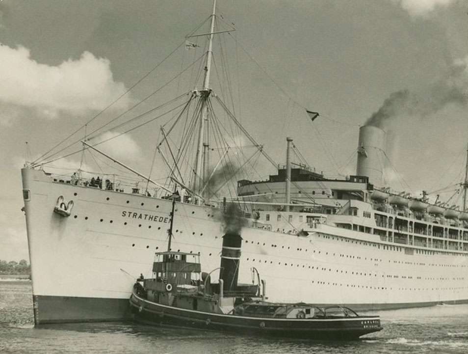 Passenger ship Stratheden being turned in the Brisbane River by the tugboat Carlock, © State Library of Queensland