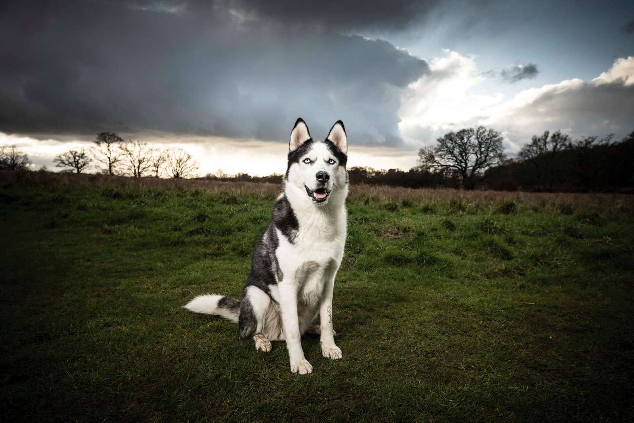 A Husky called Fonzie looking at ease in a moody landscape setting © Tony Baker