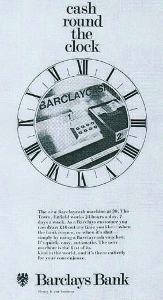 In 1966, Barclay’s was the first bank in the world to introduce credit cards. The branch at 20, The Town, Enfield, Middx, had a Barclaycard cash machine installed in that year, and customers could withdraw £10 at any hour of the day or night. It was soon clear that this was a revolutionary change in banking. Other national banks were spurred into developing a similar card, and in 1972 they jointly launched Access. However, the Cranleigh branch of Barclays did not have a cash machine for Barclaycard until 1990. (By 2004, people in Britain were spending more on retail purchases by plastic than by cash.)