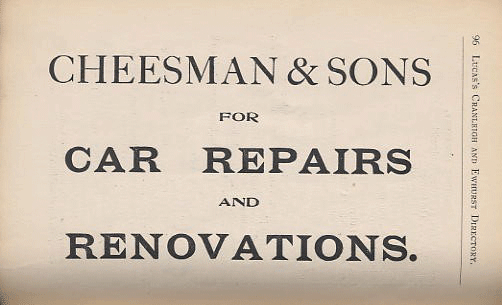 The father, Christopher, was a son of the village wheelwright, and that business had suffered an abrupt decline since the turn of the century, because of the rise of the motor car. It had moved to the High Street and now offered car renovations, painting and repairs. Several of the young Cheesmans, with their uncles and cousins, were involved in it.